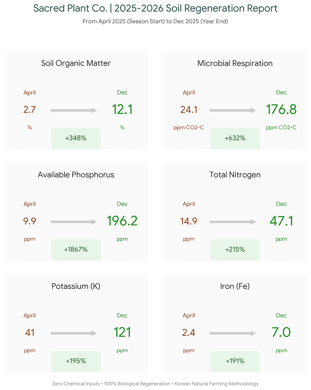 Most organic farms feed the plant. We feed the soil. The Haney Test results confirm: Sacred Plant Co has achieved a 400% increase in biological life in a single season.